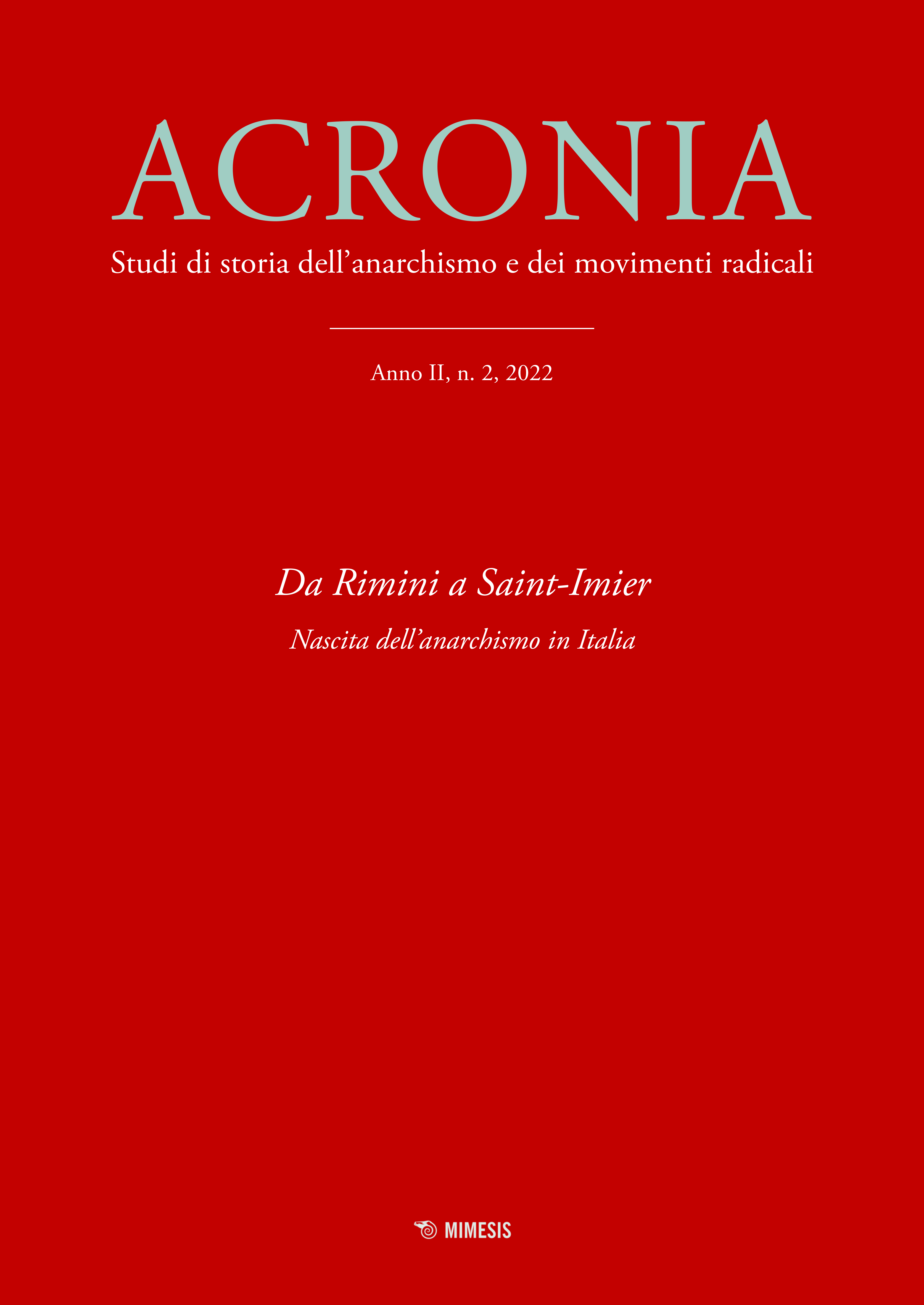 Questo numero di «Acronia» contiene gli atti della giornata di studi Da Rimini a Saint-Imier. Nascita dell'anarchismo in Italia, tenuta al Circolo Cucine del Popolo di Massenzatico (RE) il 18 giugno 2022 e organizzata dall’Archivio Storico della Federazione Anarchica Italiana (ASFAI) e dall’Archivio Storico della Federazione Anarchica Reggiana (ASFAR). Coerentemente con le nuove tendenze storiografiche, gli interventi che seguono propongono un ripensamento delle geografie e cronologie della nascita del movimento anarchico in Italia con riferimento ai suoi luoghi, alle sue pubblicazioni e ai suoi rapporti con il contesto risorgimentale. Dopo l’introduzione dei curatori, il saggio di Federico Ferretti affronta tre casi scelti del federalismo e radicalismo risorgimentale come parti della genealogia dell’anarchismo di lingua italiana. Giuseppe Sircana affronta il passaggio dal garibaldinismo radicale all’internazionalismo tramite l’esempio della partecipazione italiana all’Armata dei Vosgi e alla Comune di Parigi. In seguito, Franco Schirone discute i primi anni dell’organizzazione e delle strutture dell’Internazionale in Italia. Massimo Ortalli costruisce una bibliografia ragionata dell’Internazionale tracciandone la continuità fino alla cesura rappresentata dal fascismo. Infine, Marco Novarino affronta la questione dell’Internazionale in Sicilia analizzando le figure di Saverio Friscia e Antonino Riggio, mentre Gemma Bigi ricostruisce la formazione dell’Internazionale in Emilia nel contesto delle proteste sociali postunitarie e dei suoi collegamenti con i più noti circuiti romagnoli.