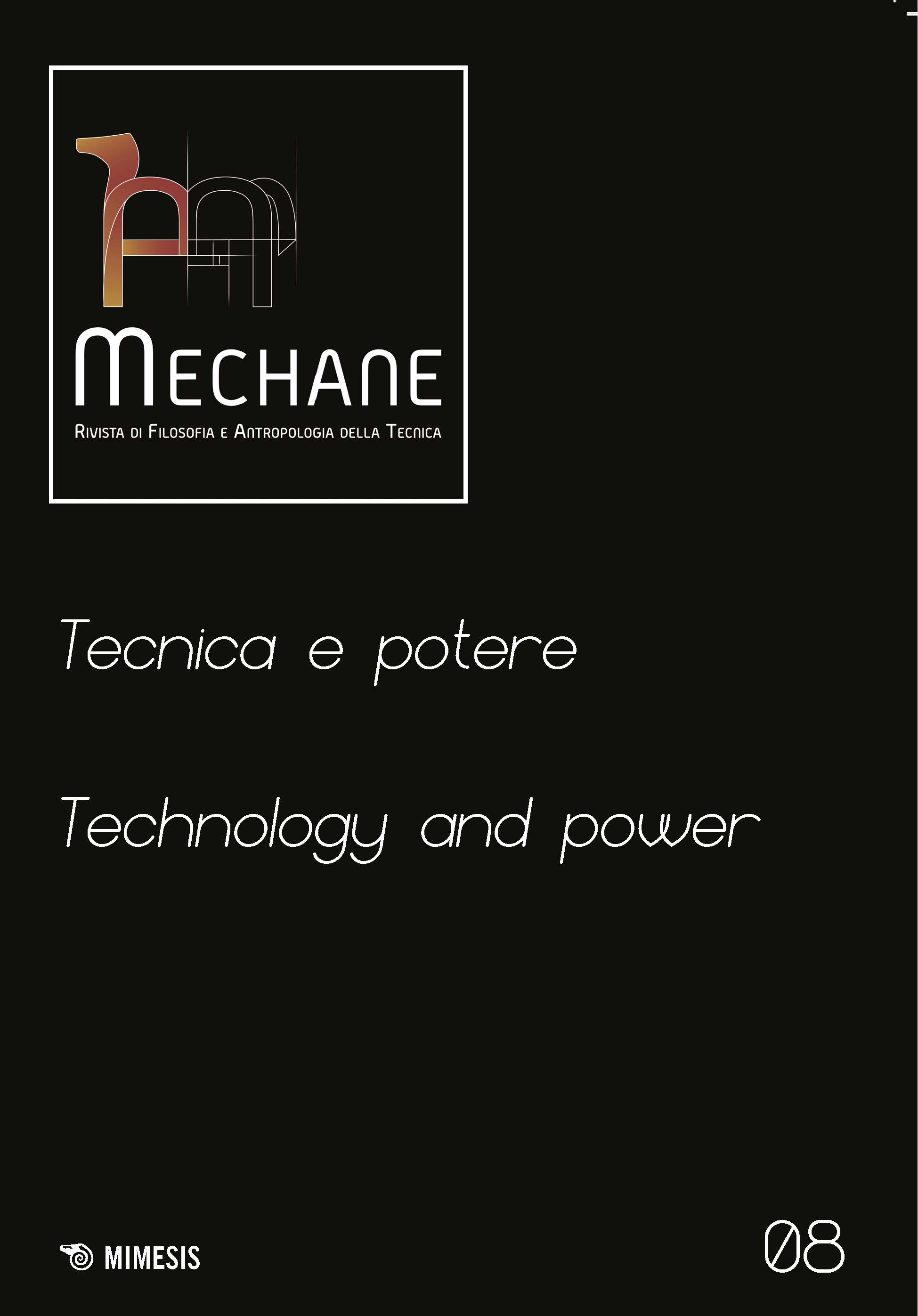 “Mechane” is an international journal that focuses on the question of technology, seen not only as a crucial topic for our present, but also as an essential question about the human condition as a whole. Philosophy of technology is meant as a theoretical framework that holds together different enterprises: ontology of the present, anthropology ad genealogy above all. The journal aims at being a meeting point – and an arena – where different and often disconnected traditions can confront with each other and communicate. Its purpose is to integrate different philosophical perspectives and fields of research concerning technology, in order to create an exchange with other disciplines and with hard sciences. From this standpoint, “Mechane” welcomes multidisciplinary contributes from many different research areas, such as history, anthropology and social sciences, neurosciences and psychology, engineering and linguistics. The contributions will be published in Italian, English, German, French and Spanish.