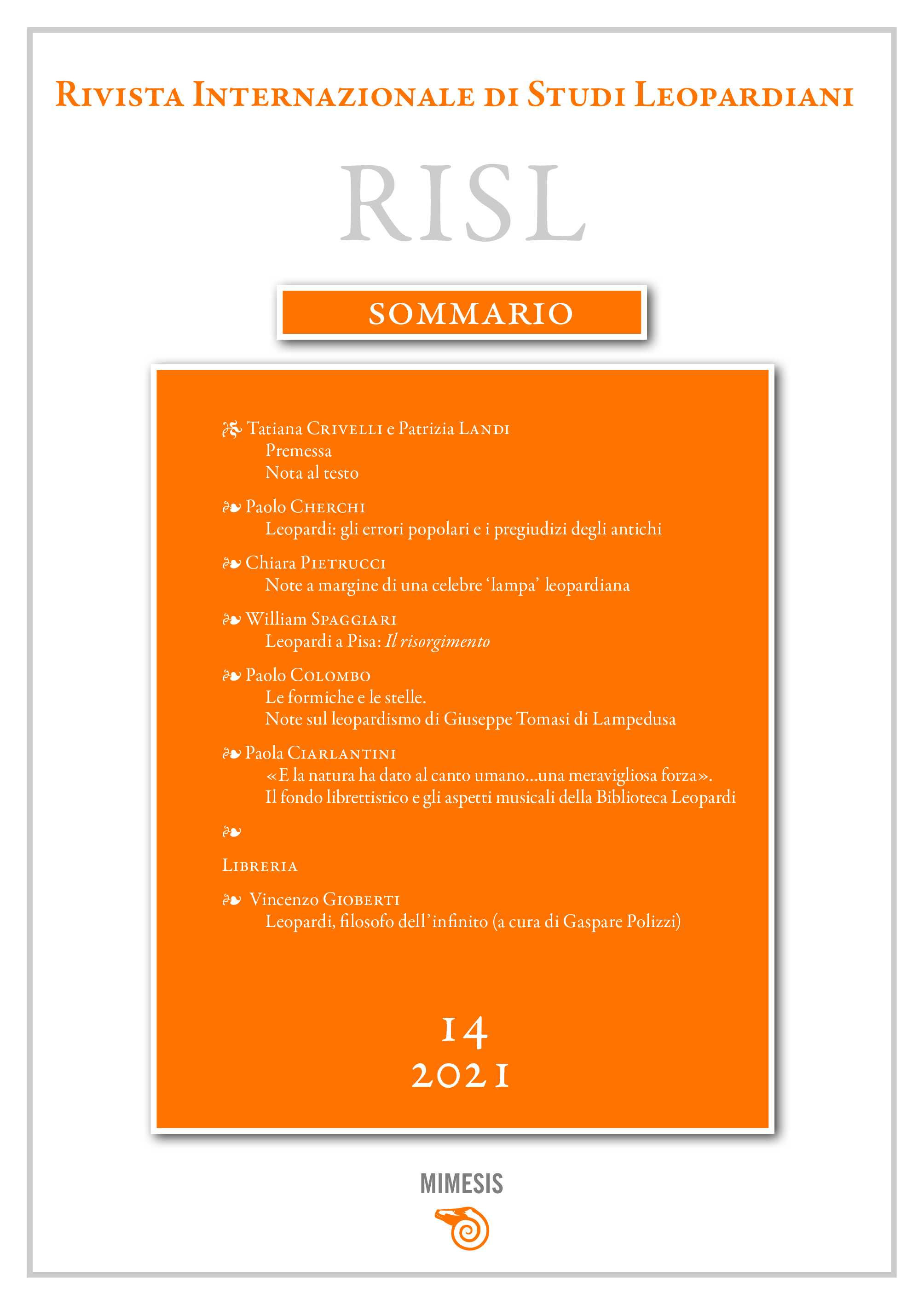 The essay aims to draw a comparison between Giacomo Leopardi and Giuseppe Tomasi di Lampedusa. Moving from a general survey on the several mentions of the poet in the prince’s literary production, the paper will then propose a study on themes (death, youth, human misery, vanity of pleasure, astronomy) and attitudes (skepticism, wit, satire) that, more than others, appear to show an authentic intersection of the two authors.
